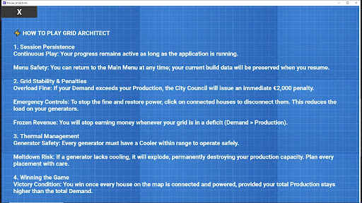 ⚡ GRID ARCHITECT The city is dark. The Council is angry. And your generators are vibrating suspiciously. In Grid Architect, you take on the high-stakes role of a lead electrical engineer tasked with bringing a blackout-stricken city back to life. It’s a delicate balancing act of infrastructure, economics, and thermal dynamics.